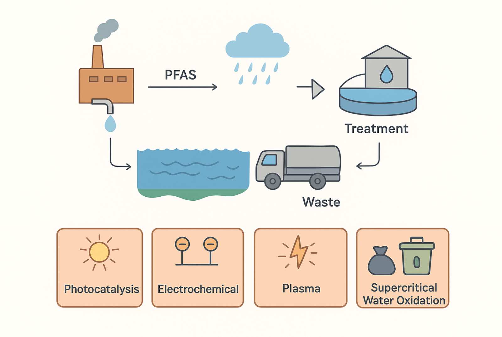 이처럼 PFAS 제거를 위한 기술들은 다양하게 발전 중이다. 광촉매를 이용한 빛 활성 분해, 전기화학 기술, 나노 정화, 초임계수 산화, 플라스마 처리 등 모두 각기 장단점이 있으므로, 앞으로는 복합 시스템 형태로의 통합이 현실적 대안이 될 수 있다. 예를 들어, 정수장에서 PFAS를 먼저 흡착한 뒤, 초임계산화 또는 플라스마 기술로 이를 완전 분해하는 식이다. 연구자들은 이런 접근이 장기적으로 PFAS 없는 깨끗한 수질 환경을 만드는 데 핵심적인 역할을 할 것으로 보고 있다.
