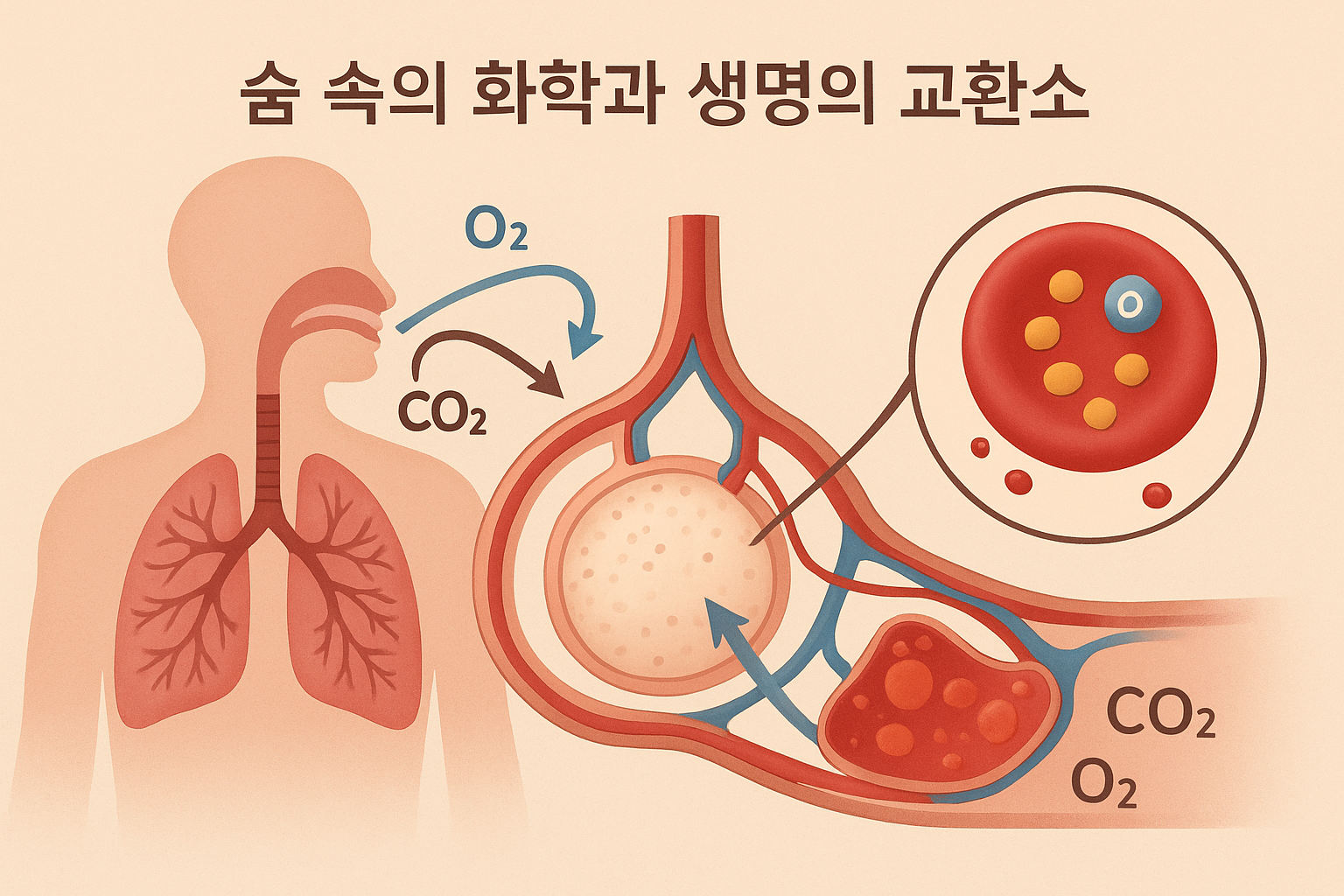 폐의 가장 작은 단위인 폐포는 직경 약 200 마이크로미터의 공기주머니 형태의 구조다. 이 안쪽은 얇은 단층 상피로 덮여 있으며, 외부는 모세혈관이 그물망처럼 감싼다. 공기 중 산소는 폐포막을 통과해 혈액 속으로 확산(diffusion)되고, 반대로 CO₂는 혈액에서 폐포로 이동한다. 이 단순한 확산은 분압 차(partial pressure gradient)라는 물리 법칙에 의해 이루어진다. 폐포의 산소 분압(약 100 mmHg)은 정맥혈의 산소 분압(약 40 mmHg) 보다 높기 때문에 O₂는 자연스럽게 혈액으로 이동한다. 이 과정은 단순한 기체 확산이지만, 그 효율은 놀랍다. 폐의 전체 표면적은 약 70㎡로, 테니스 코트의 약 1/3 크기다.