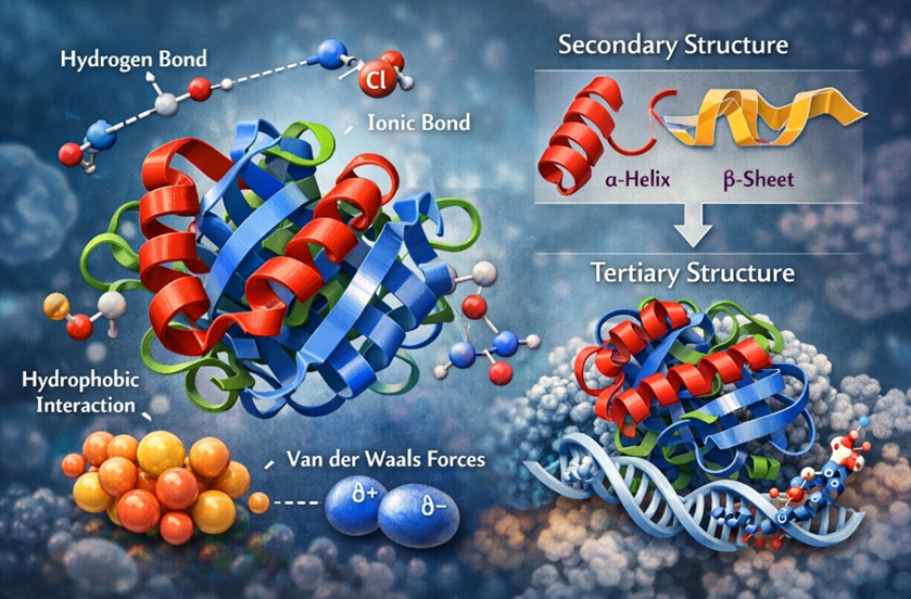 종합적으로 보면 공유 결합은 단백질의 기본 구조를 형성하고, 수소 결합과 이온 결합, 소수성 상호작용, 그리고 반데르발스 힘은 상대적으로 약한 힘이지만 함께 작용하여 단백질 형태를 안정화시킨다. 단백질의 구조는 하나의 강한 결합이 아니라 여러 약한 화학적 상호작용이 결합된 결과라고 할 수 있다. 단백질의 구조는 순서대로 1차, 2차, 3차, 그리고 4차 구조로 형성된다. 단백질 아미노산이 3차 구조를 형성할 때 수소 결합, 이온 결합, 소수성 상호작용, 그리고 반데르발스 힘이 작용한다. 각 결합의 힘은 크지 않지만 여러 결합이 합쳐지면 단백질의 입체적인 형태를 유지하기에 충분하다. 예를 들어 수소 결합은 전기음성도(Electronegativity; 원자가 공유 전자를 끌어당기는 정도)가 큰 원자(O, N 등)에 결합된 수소가 다른 전기음성 원자에 약하게 끌리는 힘이다. 또 다른 결합인 공유 결합은 두 원자가 전자를 공유하여 형성되는 강한 결합으로, 단백질의 아미노산을 연결하는 펩타이드 결합이 이에 해당한다. 이온 결합은 양전하와 음전하를 띠는 두 원자 사이의 정전기적 인력으로, 단백질에서는 서로 반대 전하를 가진 아미노산 사이에서 형성되어 구조를 안정화시킨다. 다음으로 소수성 상호작용은 물과 상호작용하지 않는 부분들이 서로 모이려는 경향을 의미한다. 이는 물이 극성 물질이기 때문에 비극성 부분이 서로 뭉치게 되는 현상이다. 마지막으로 반데르발스 힘은 매우 약한 인력이지만 분자 사이 공간을 채워 전체 구조를 안정화시키는 역할을 한다.